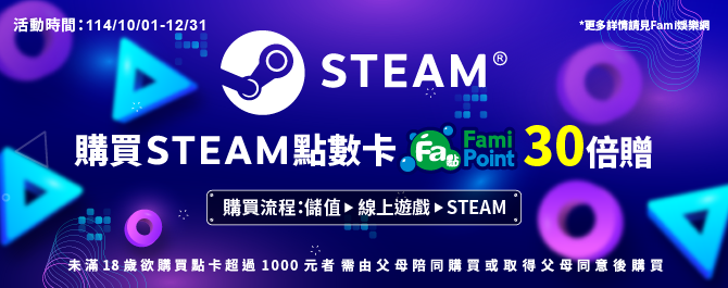 📢活動方式:至 FamiPort / 全家APP / MyFamiPort APP 購買Steam點數卡,Fa點30倍贈